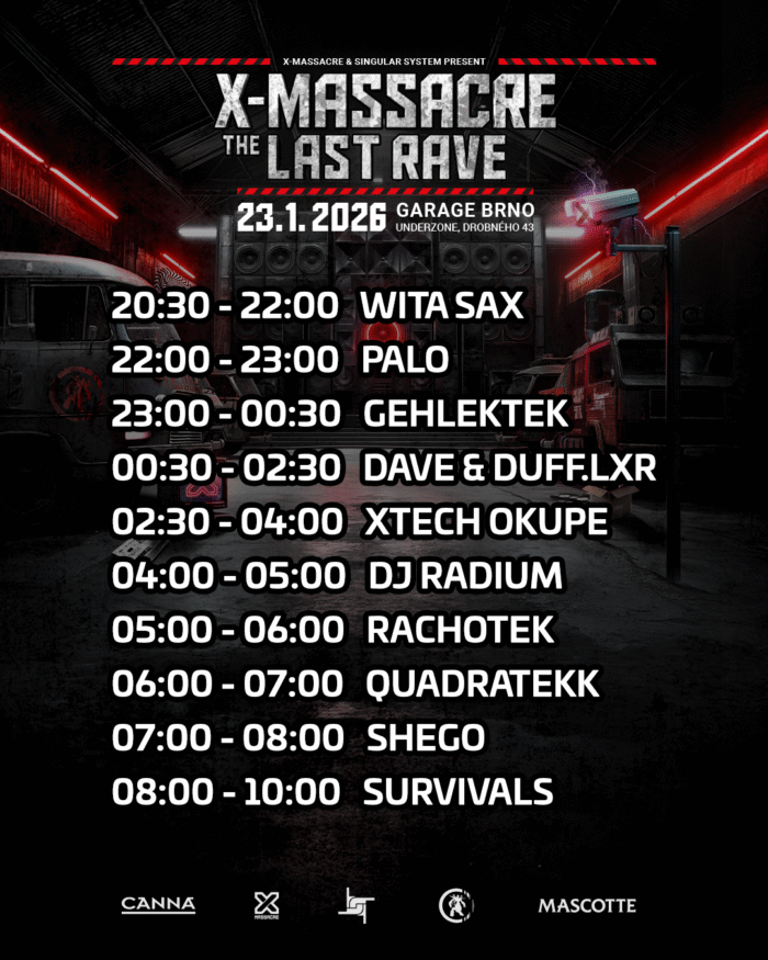 Tak je to tu, dnes proběhne vůbec poslední X-MASSACRE a to v brněnských podzemních garážích. Zbývá posledních 20 vstupenek v předprodeji, na místě budou v limitovaném množství za 450 Kč. Důležité info níže, prosíme čekujte to. 👇 Díky a vidíme se večer! 🤩